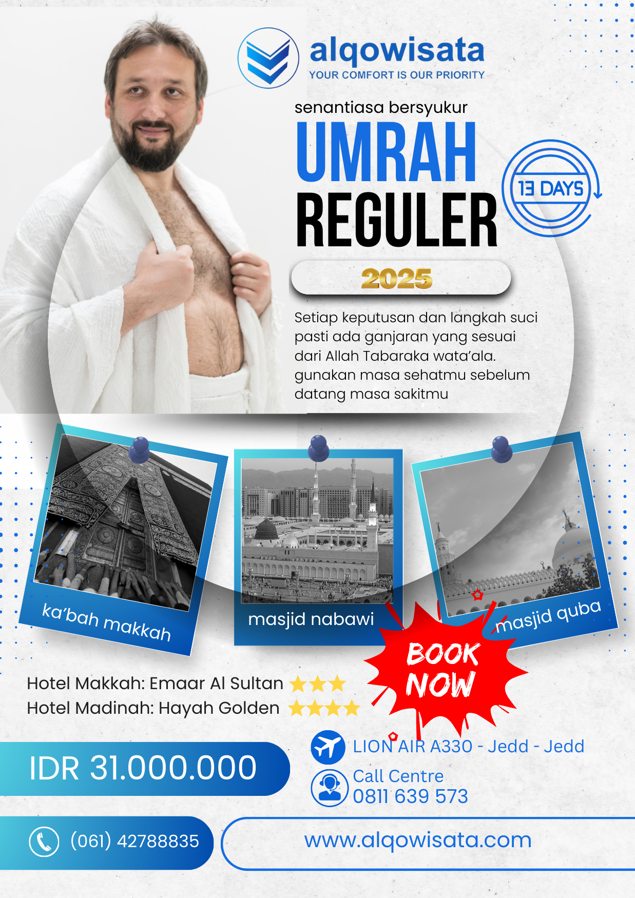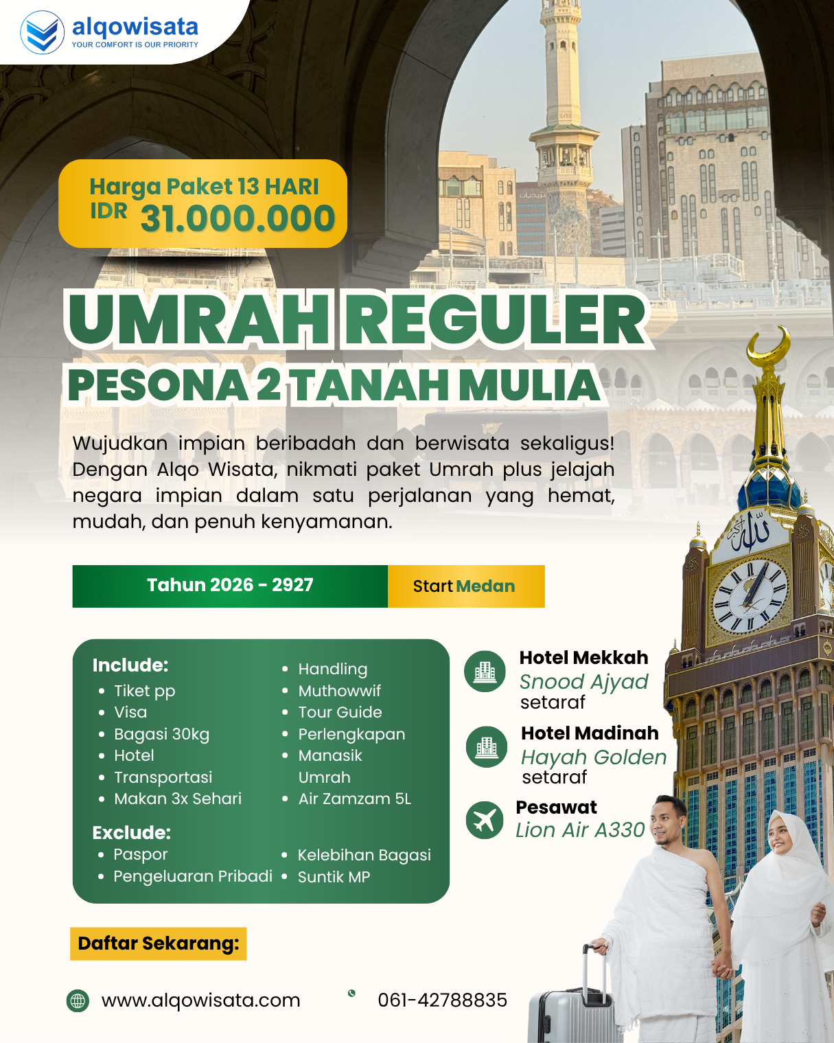 Umrah Paket Maqbul adalah paket Ibadah Umrah dengan fasilitas Standart berdurasi 13 Hari. Alqo Wisata menawarkan akomodasi yang sesuai dengan harga paket. Walaupun Paket ini Tergolong Standart Namun Insha Allah tidak mengurangi pahala dan keutamaan Ibadah Umrah itu sendiri, tersedia harga khusus bagi anda yang mendaftar melalui Website ini. Silahkan membaca detail paket umrah Alqo Wisata ini dengan baik dan seksama agar dapat difahami secara maksimal.